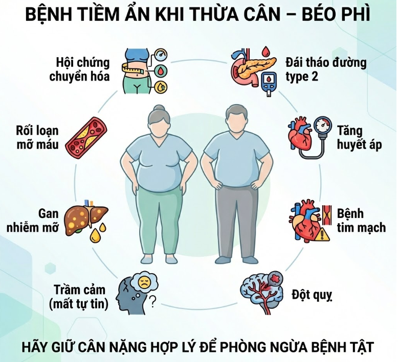 Thừa cân, béo phì không chỉ ảnh hưởng đến vóc dáng mà còn là yếu tố nguy cơ hàng đầu của nhiều bệnh lý mạn tính. Đáng lo ngại hơn, phần lớn các bệnh này tiến triển âm thầm, ít triệu chứng ở giai đoạn sớm nhưng để lại hậu quả nặng nề nếu không được phòng ngừa và kiểm soát kịp thời.