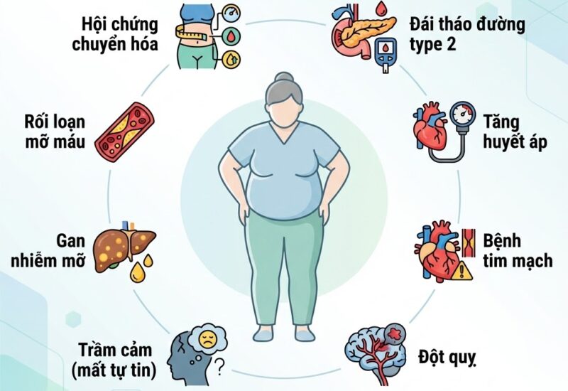 Béo phì liên quan đến tình trạng viêm mạn tính mức độ thấp, làm suy giảm miễn dịch; đồng thời dễ gây stress, lo âu và trầm cảm, ảnh hưởng đến chất lượng sống.
