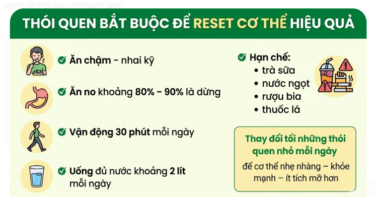 Tuy nhiên, cần hiểu rằng reset cơ thể không phải là nhịn ăn hay áp dụng các phương pháp detox cực đoan, mà là quá trình điều chỉnh lại thói quen dinh dưỡng và lối sống một cách khoa học, nhẹ nhàng và bền vững.