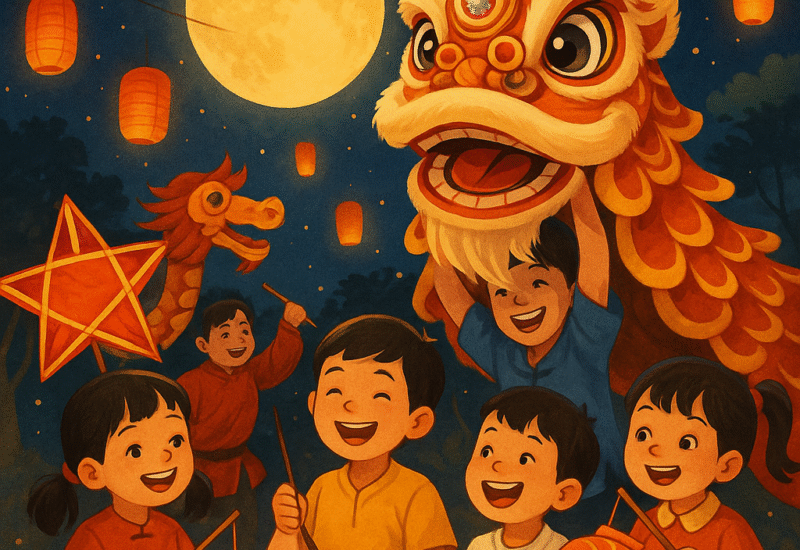 🌕 Rước đèn ông sao: Trẻ em cầm đèn lồng, đèn ông sao, đèn cá chép, cùng nhau đi khắp xóm làng trong tiếng trống rộn rã.