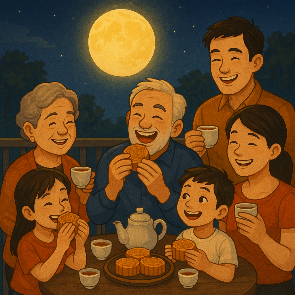 🌕 Ngắm trăng, uống trà, thưởng nguyệt: Người lớn ngồi bên nhau, vừa ăn bánh vừa thưởng trăng, cùng trò chuyện về cuộc sống.